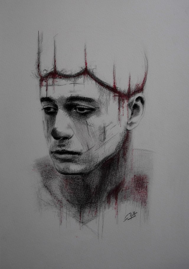 Dessin à la pierre noire et maquillage sur papier A3